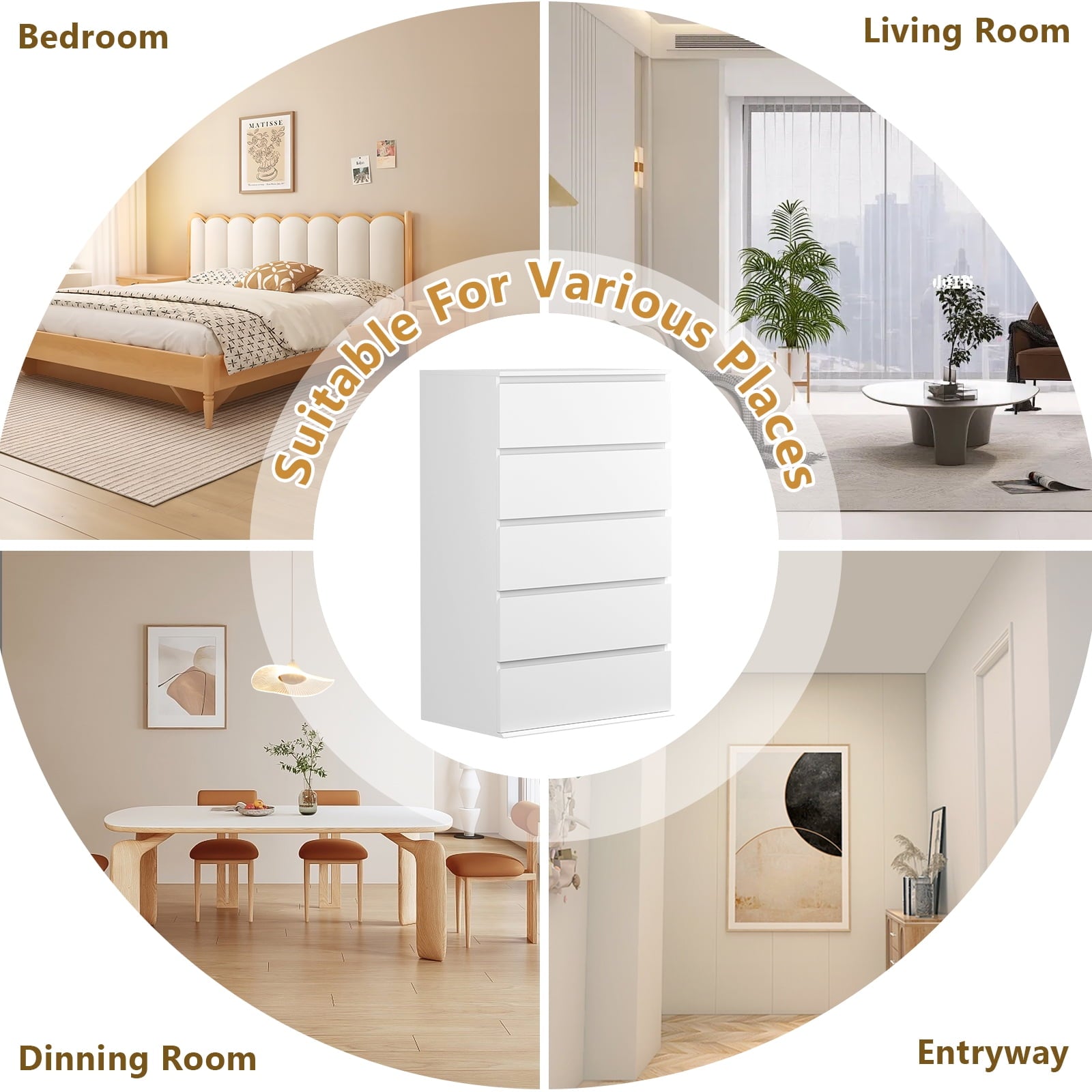 Simple Modern Design: This 5-drawer chest adopts a simple modern style. Its simple design makes it more versatile and can match any home style. The chest of drawers is sprayed in white color with simple straight lines. This elegant design can make your room or office look neater and brighter, showing your good taste.