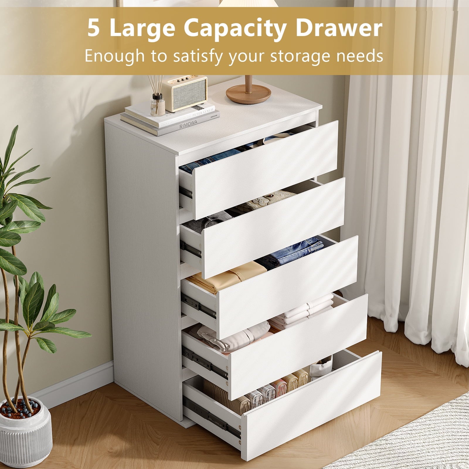 - 5 Huge Drawers: This vertical dresser cabinet has six large storage drawers. Two smooth slides are installed with every drawer unit, so they are easy to pull in or pull out. More importantly, this white dresser uses a unique handleless design that does not occupy any space and looks more elegant.