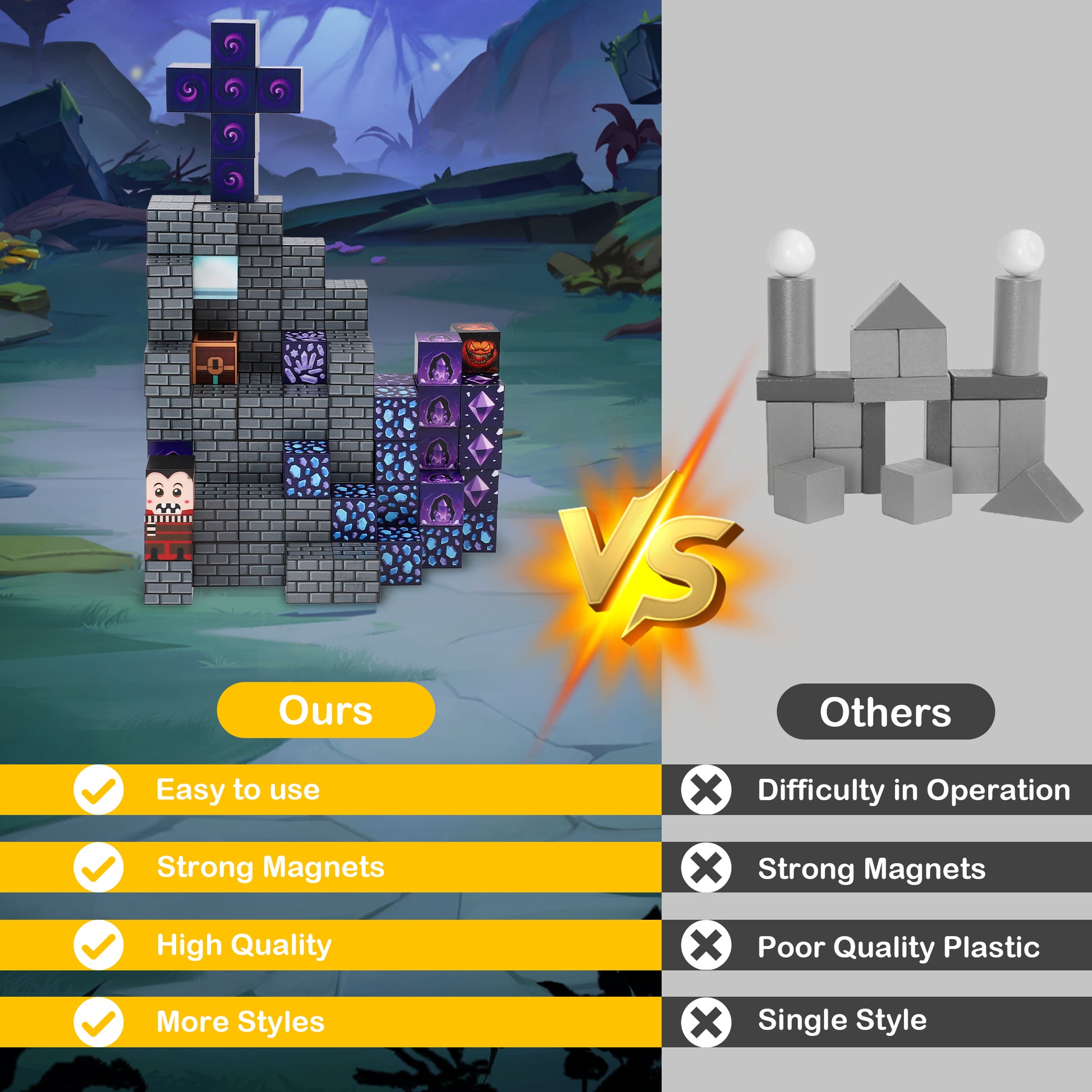 🧲[Build My Magnet World - Lava Cave World]Get ready to simulate building a cave in "" Lava Cave"" with this new magnetic cube set, imagine the amazing stories that could happen in Lava Cave World, and start your Lava Cave world adventure! Magnetic building blocks allow your child to travel to a world full of wonderfulRoad Track or a fantasy world full of possibilities! From simple to challenging builds, experience the fun of role-playing and dress-up toys! Let your children's imagination run wild in our magnetic open-ended toy set!💡[Perfect Sensory Toys for Kids]Magnetic building blocks provide children with a great way to learn, play and increase their confidence while giving them a better understanding of the world of construction. When playing with the blocks, the blocks will also rustle like little bells, which will attract the attention of toddlers and make them happy. Construction and building block toys unlock many skills for children. With this magnetic building block to build, rotate, destroy and rebuild, it helps to develop children's creative thinking, attention and patience, hand-eye coordination motor skills, cooperation skills, spatial and motor skills!😃[Toy Magnetic Set for Toddlers and Beginners]Unlike other magnet toys on the market, our magnetic cube set has super strong internal magnets, which makes it easier for toddlers over 3 years old to stick the cubes together and make the structure sturdy. The rounded edges and suitable size will not hurt small hands. The perfect toy can help children to have a deeper understanding of the world of structure and understand magnetism. Recommended toy gift for toddlers and children aged 6-8 years old.📖[Creative Fun Learning]Construction and building block toys unlock many skills for children. Building, rotating, destroying and rebuilding with this magnetic building block helps promote children's creative thinking, attention and patience, cooperation, space and motor skills. Comes with a creative manual to guide and inspire them to explore the magnetic dream world. It is a fun solo activity or activity with friends, and a great alternative to screen time.🎁[Best Gift for Kids]This is a children's toy suitable for classrooms, toddlers, preschoolers, teenagers, and is popular with boys and girls over 3 years old. Therefore, even young children can imagine and create the buildings of their dreams. Kids will have fun with this magnetic tile and learn through playing. A perfect educational gift for birthdays, Christmas, Children's Day, STEM and school activities. Make it the best choice for parent-child interactive games on weekends!