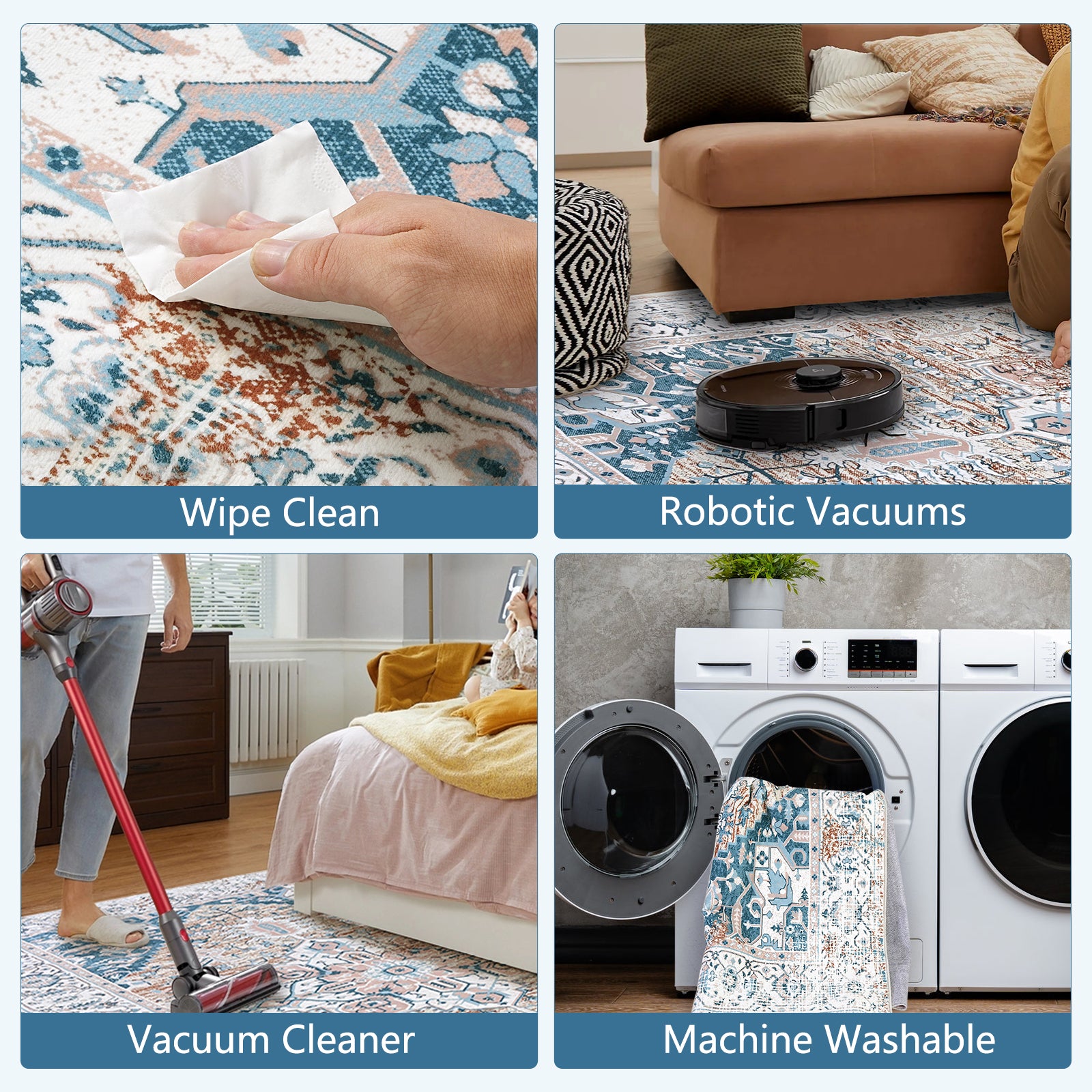 【Machine Washable Carpets are Easy to Clean】-Machine washable carpets can be cleaned daily using a vacuum cleaner, broom or rag to prevent dust and debris from getting into the fibers. Washing machines and dryers can also be used for deeper cleaning. Vacuum regularly to keep the carpet clean during daily use.