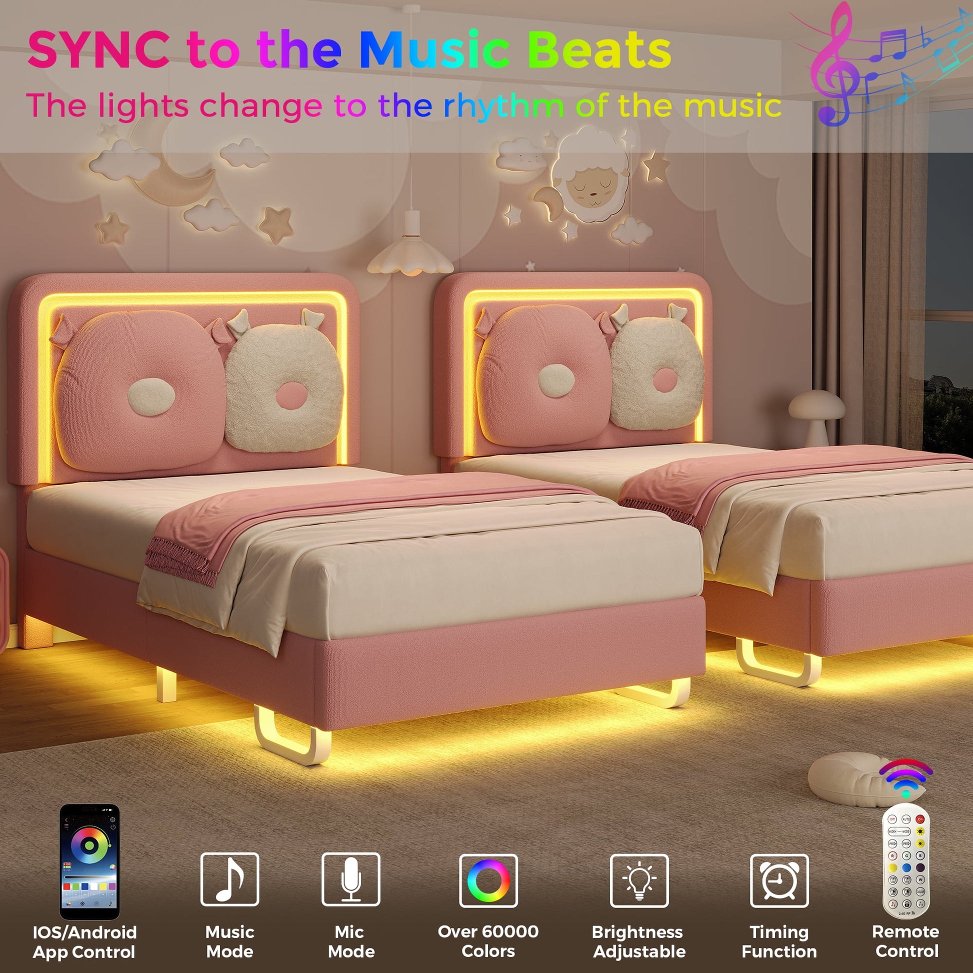 - 【SMART RGB LIGHTS WITH MUSIC SYNC】: This beige twin bed frame with built-in RGB LED headboard and underbed transform your bedroom with over 16 million colors, 20+ light effects, and dynamic modes controlled by app or remote. Bold lights sync with music, setting the ideal vibe for relaxing, reading, or entertaining. From gentle nightlight for kids to vivid party colors, this bed frame makes every moment magical with immersive ambiance